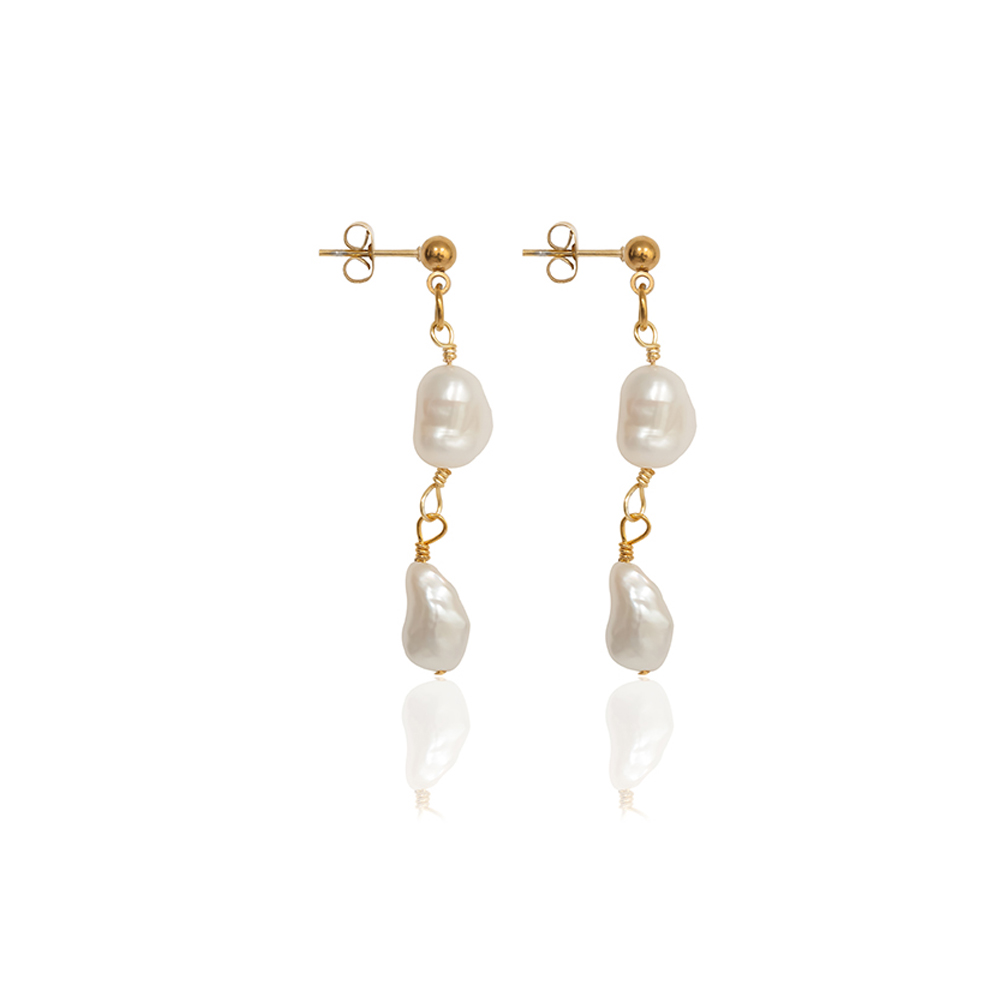 Introducing Blair Pearl Studs. Featuring two fresh water pearls suspended from stainless steel studs. Perfect pearl hoops perfect for day to night style.