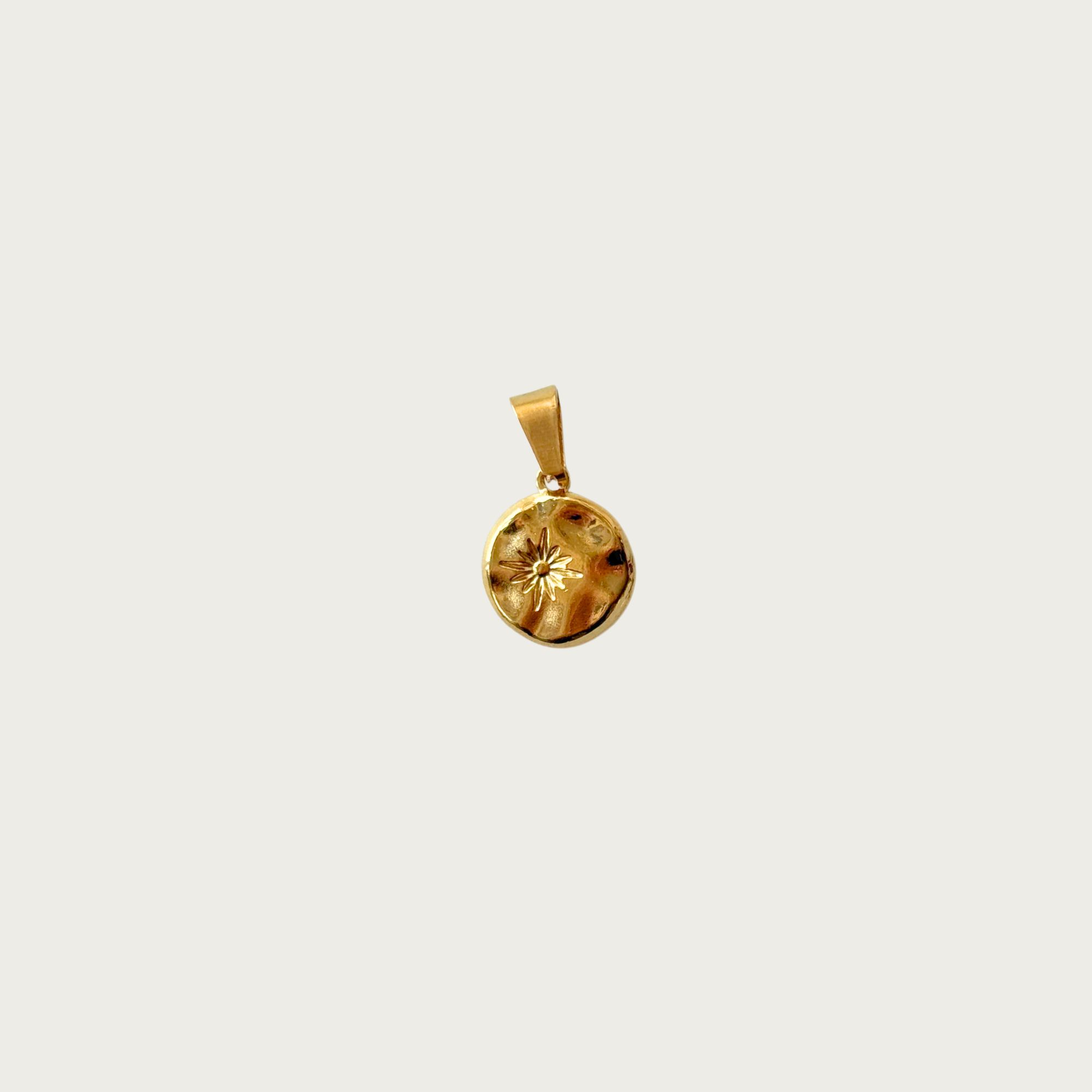 Measuring 20mm x 15mm, the pendant features a delicately engraved compass star set into a gently textured, molten-like surface. It catches the light beautifully, adding a subtle, intentional shine to your necklace stack.