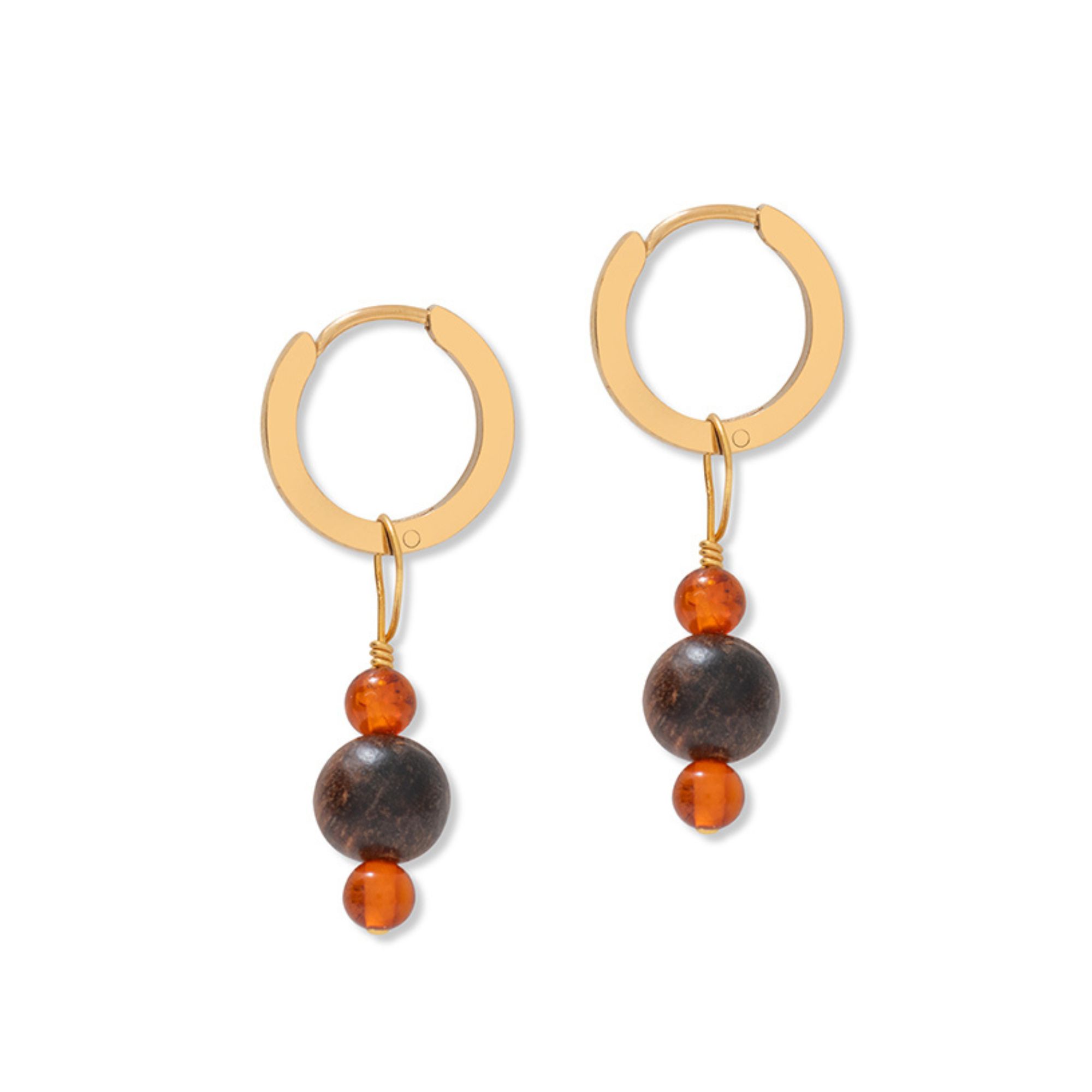 Add a touch of warm, natural elegance to your everyday look with these chic hoops. Featuring small amber beads paired with a single dark wooden bead, suspended from a sleek, modern hoop, they strike the perfect balance between minimalist and distinctive.