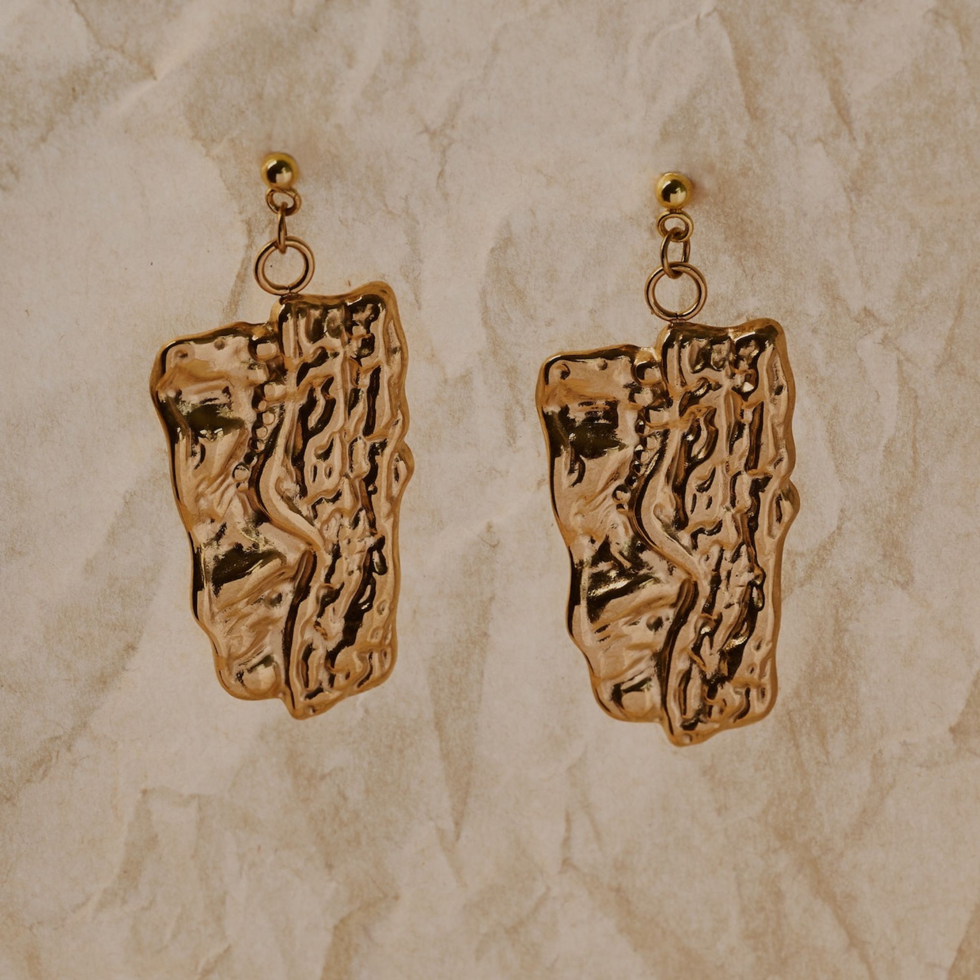 Suspended from a simple gold stud, an abstract form falls with an organic, fluid surface, designed to catch the light and create quiet movement.