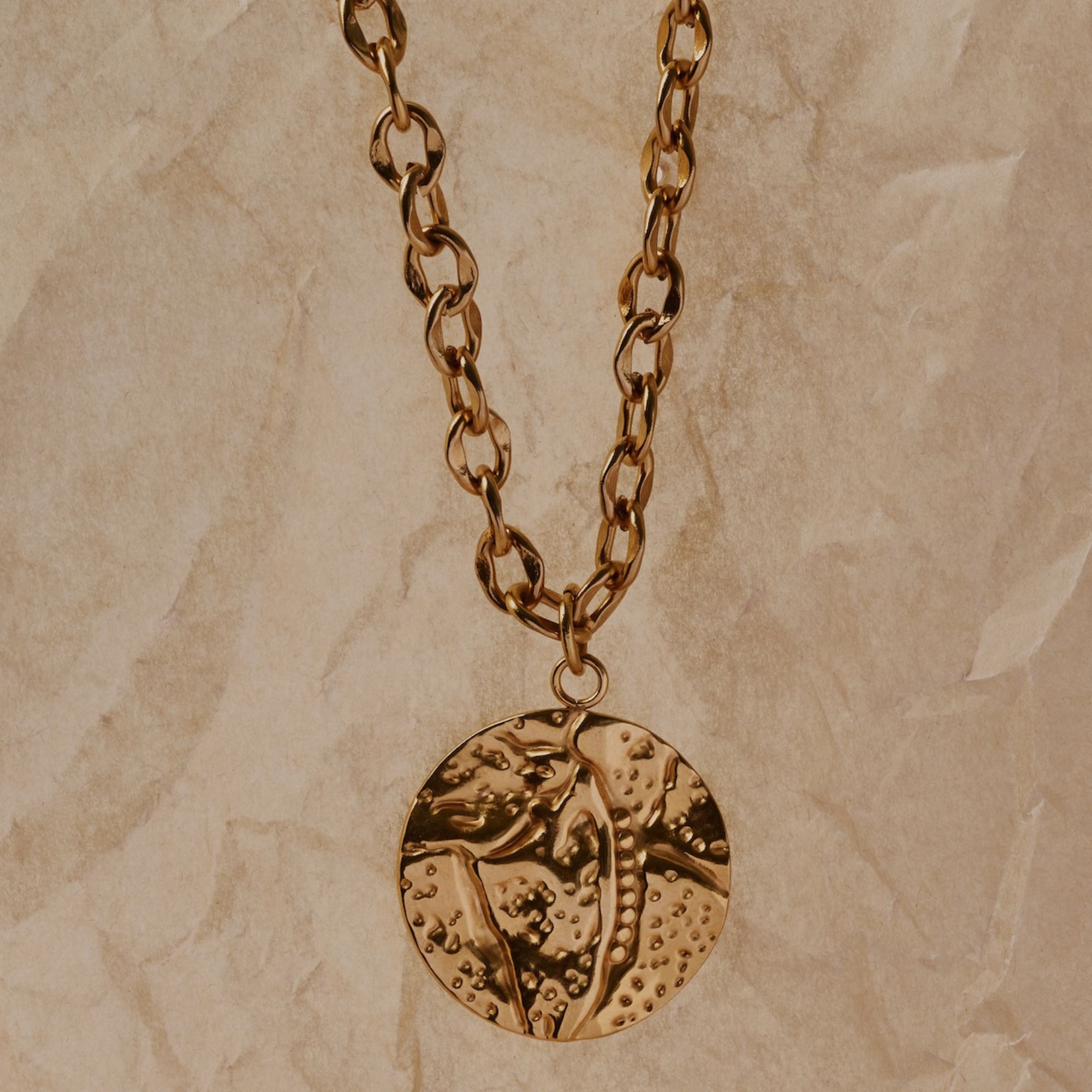 Beverley is bold in its simplicity. A sculptural, oval curb chain carries a softly irregular pendant textured, organic, and designed to catch the light with every movement.