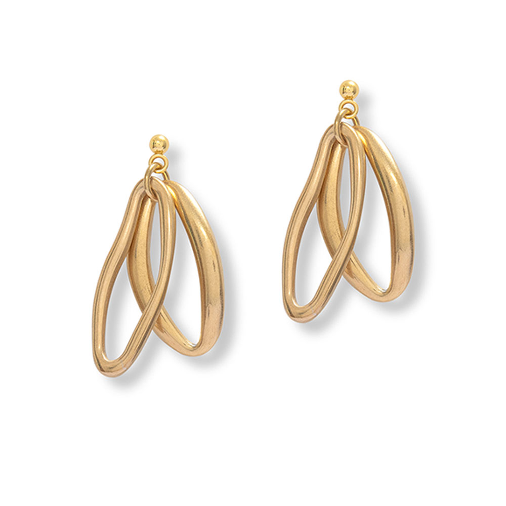 Two abstract shapes fall from a simple gold stud. Softly sculptural, with movement that feels effortless and light.