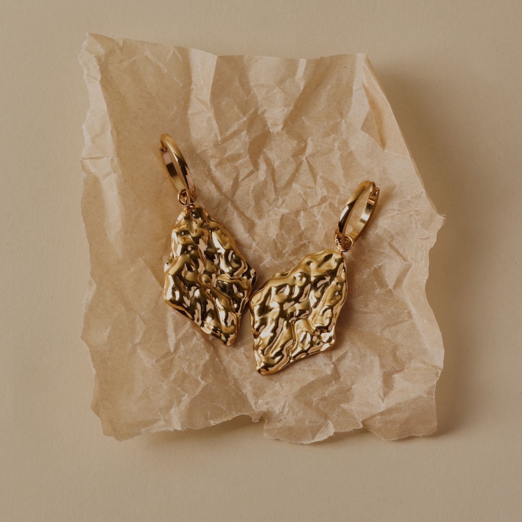 A classic gold hoop is paired with a fluid, textured form — irregular, light-catching, and designed to feel almost molten in movement.