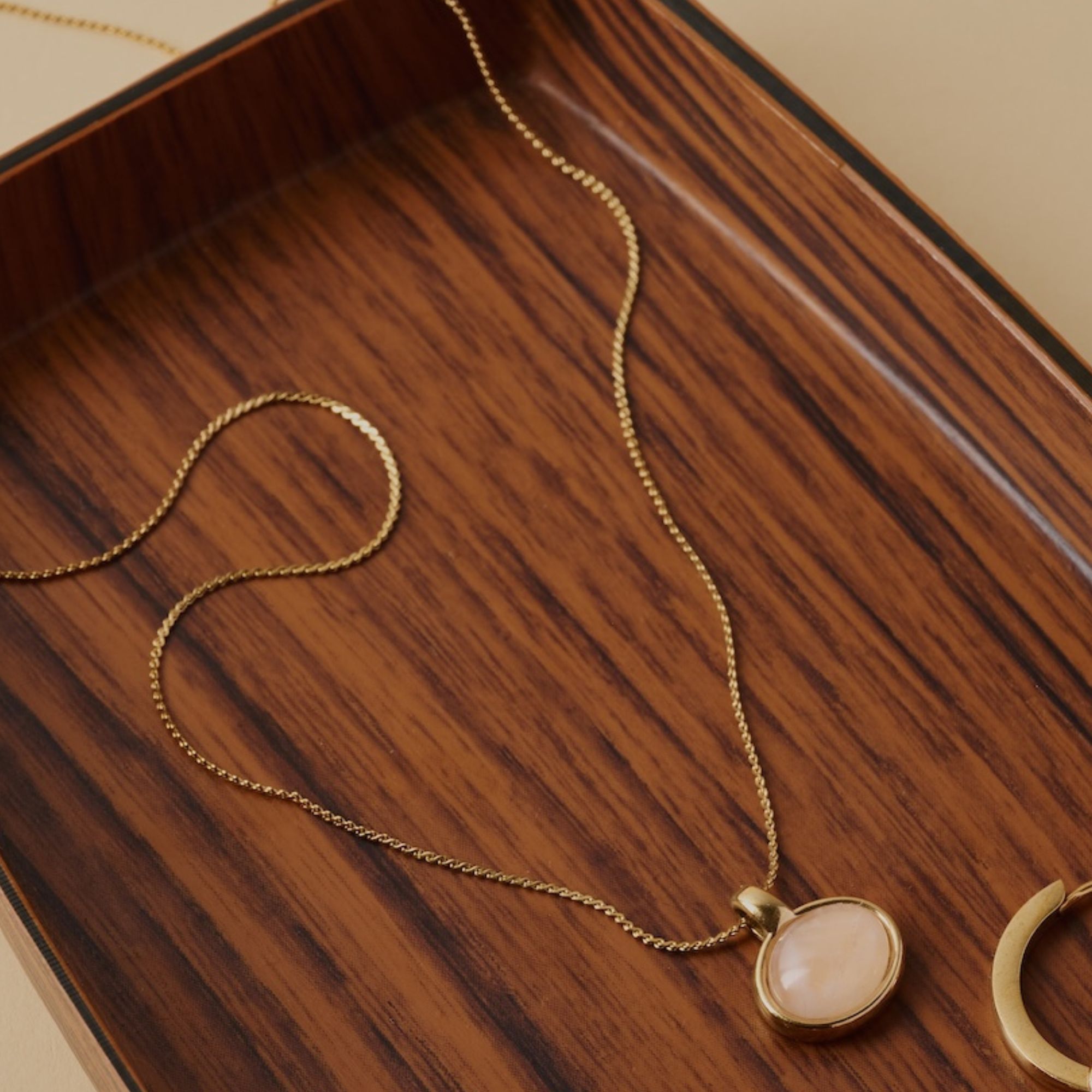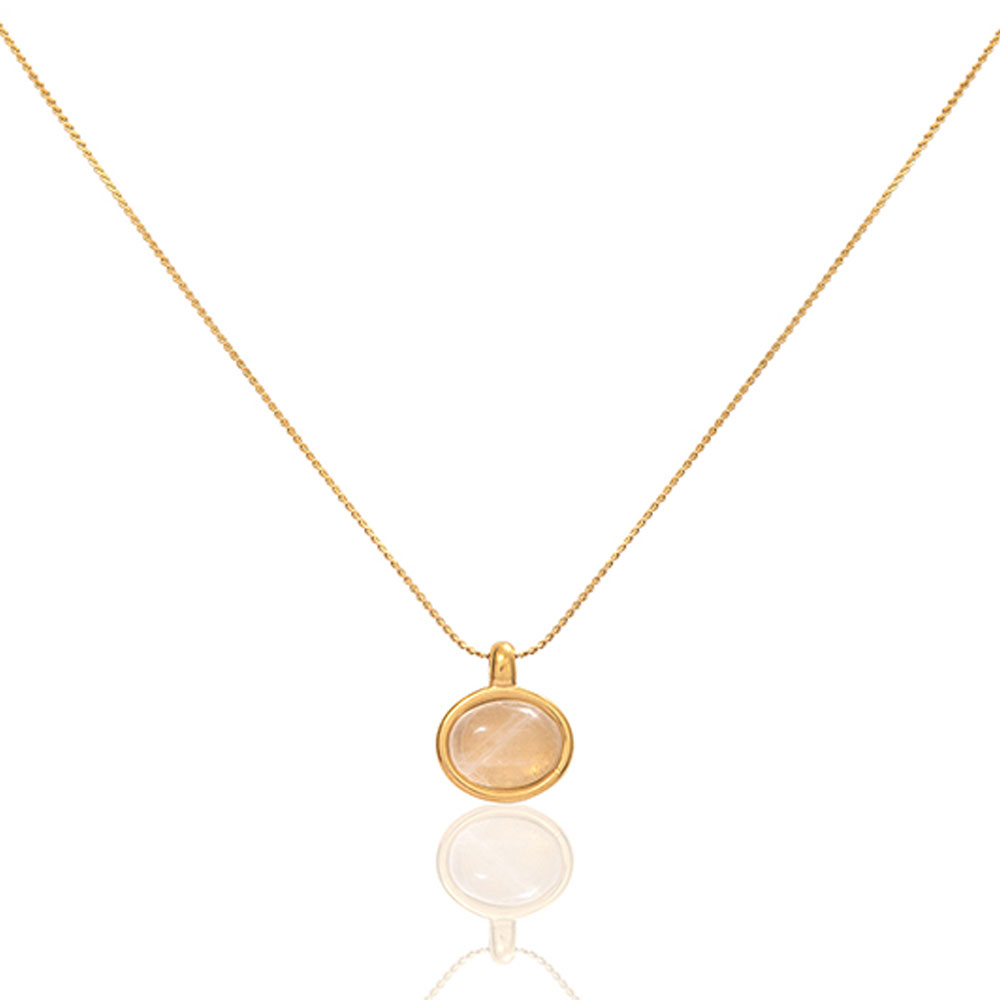 A smooth cream stone sits within a delicate gold setting, suspended from a fine chain. Subtle in tone and designed to rest gently against the skin.