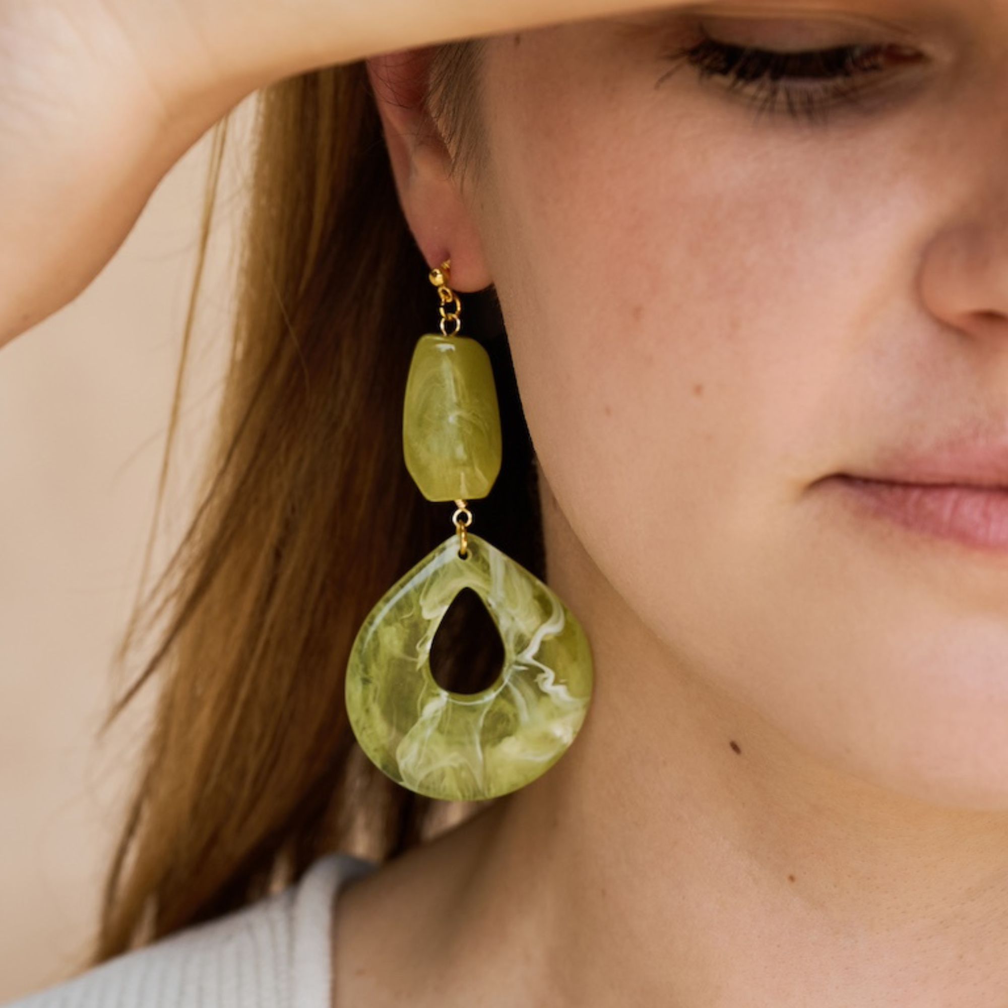Featuring a large oval style pendant and green bead crafted from eco friendly resin suspended from either a 18k gold plated alloy stud or upgrade to non tarnish stainless steel studs. Perfect for stand out days beside the pool or even date nights.