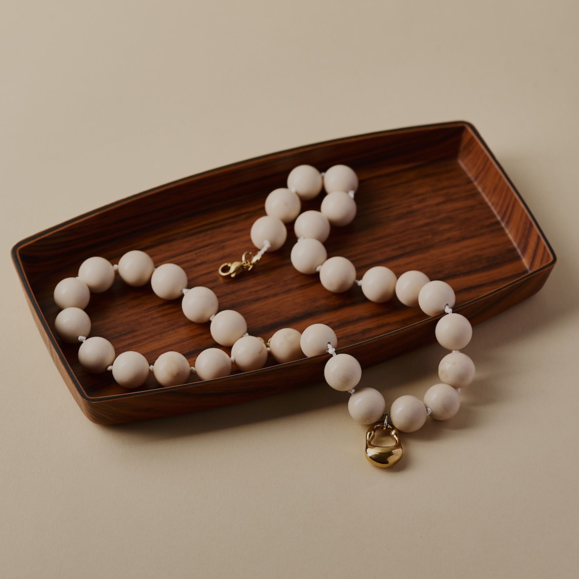 Smooth cream river stone beads, individually knotted, sit gently against the skin, finished with an abstract gold charm that catches the light in quiet moments.