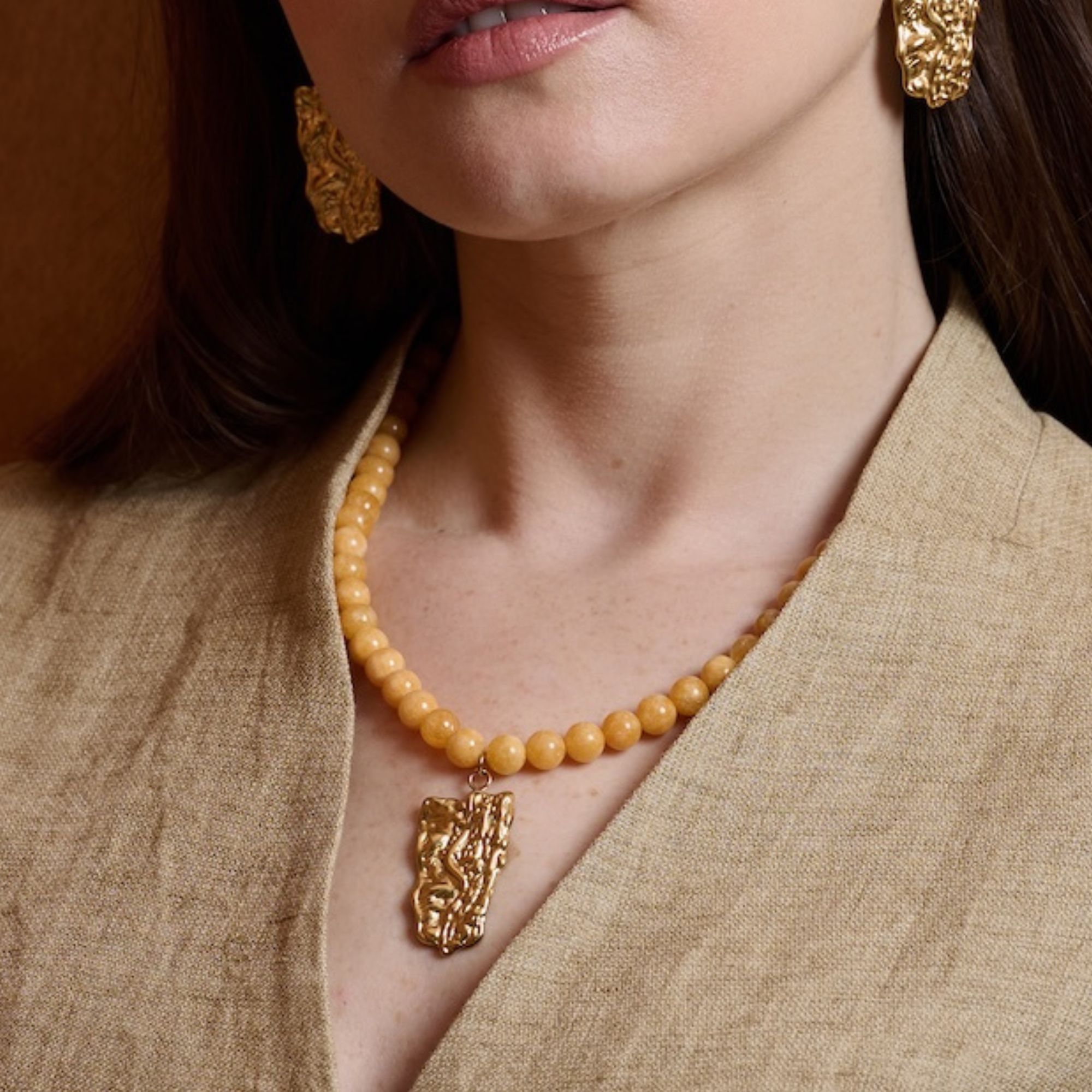 Soft butter yellow chalcedony jasper beads bring a gentle glow, centred with a sculptural gold form, irregular, detailed, and designed to catch the light.